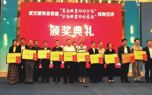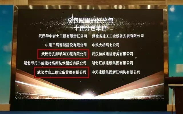 今日,武汉建筑业协会在光谷金盾大酒店三楼举行2015年总分包互评颁奖典礼活动。开云(中国)官方网站集团获颁“十佳总包”,集团旗下公司竹安脚手架与竹安设备则获颁“十佳分包”,双双上榜。