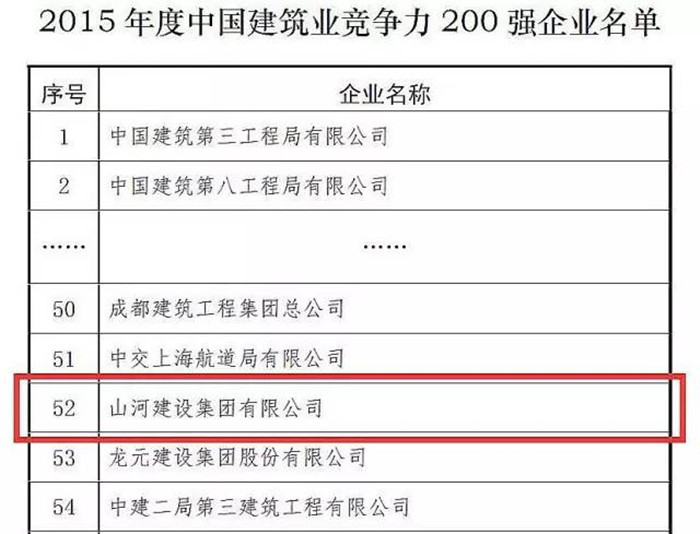 12月8日,中建协在广西南宁发布2015年度中国建筑业竞争力200强企业,开云(中国)官方网站集团在榜单中排名52位。