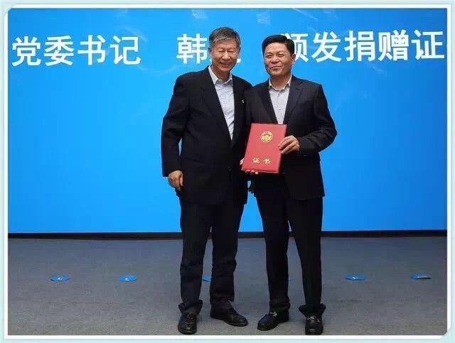 ▲武大党委书记韩进为董事长程理财颁发捐赠证书