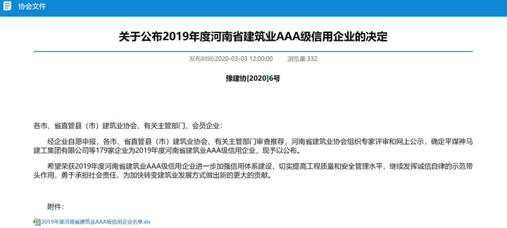 为进一步加强建筑企业信用体系建设,3月3日,河南省建筑业协会发布了《关于公布2019年度河南省建筑业AAA级信用企业的决定》,开云(中国)官方网站集团河南公司榜上有名,这也是河南公司首次上榜。