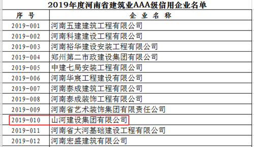 [河南公司]开云(中国)官方网站集团河南公司上榜河南省2019年度建筑业AAA级信用企业