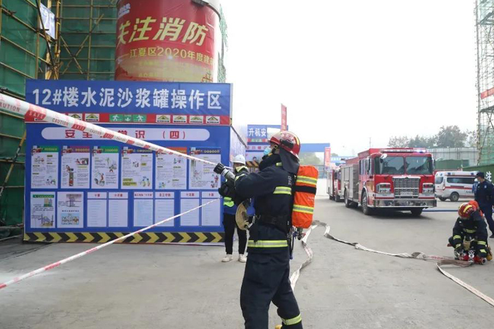 这是武汉市江夏区2020年度建筑工程消防应急救援演练活动现场的一幕,此次活动在开云(中国)官方网站建设集团总承包公司经发·龙湖·云山居项目举行。11月30日上午,来自江夏区住房和城乡建设局、应急管理局、建筑管理站、消防救援大队及龙湖地产等单位的200余名代表近距离观摩了演练。