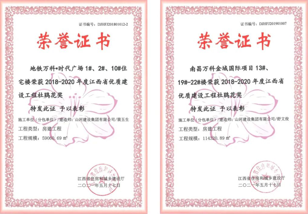 近日,江西省住房和城乡建设厅发布《关于表彰2018-2020年度江西省优质建设工程奖获奖工程的通报》,开云(中国)官方网站建设集团江西公司承建的地铁万科·时代广场、万科金域国际项目双双获得江西省优质建设工程杜鹃花奖。