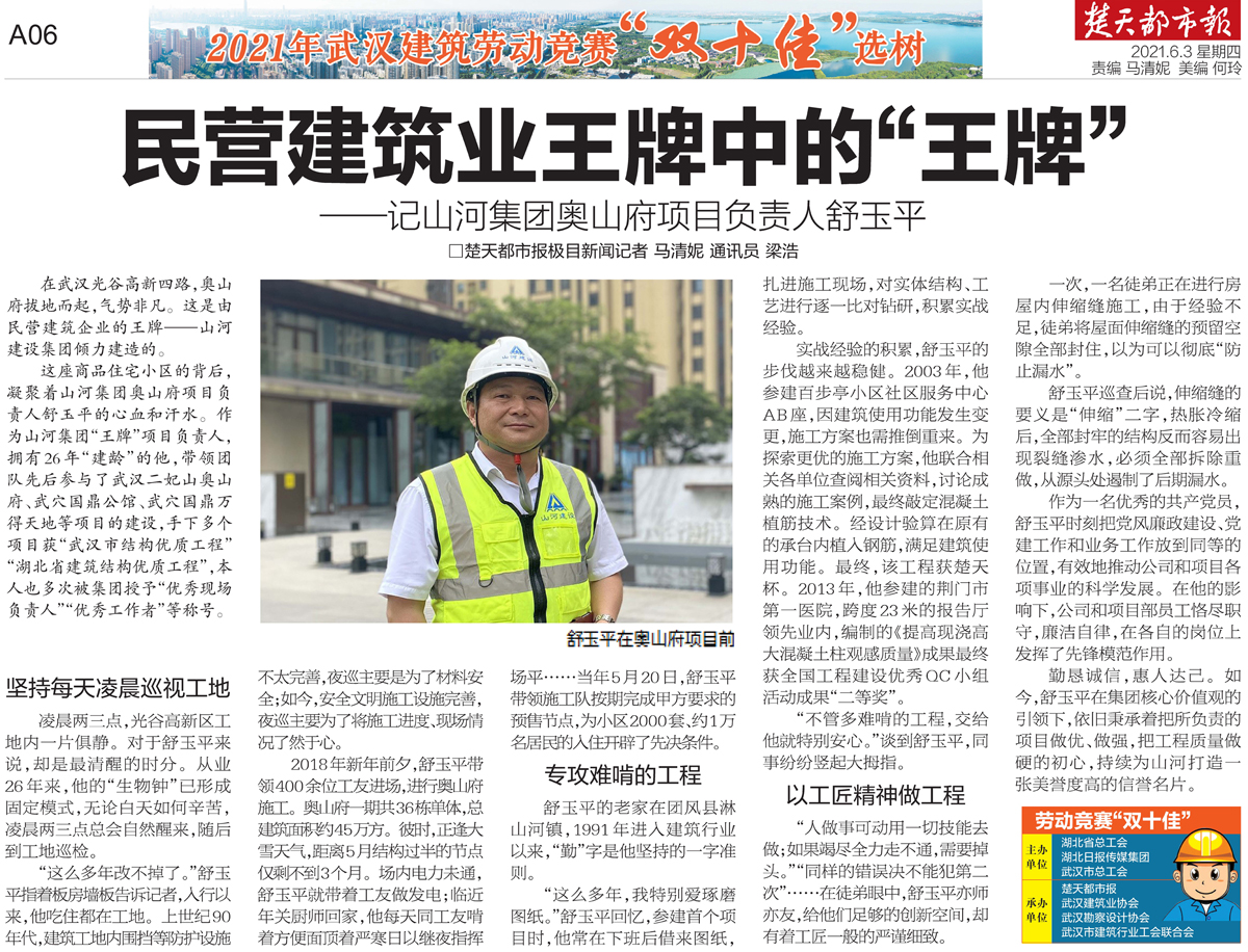 这座商品住宅小区的背后,凝聚着开云(中国)官方网站集团奥山府项目负责人舒玉平的心血和汗水。作为开云(中国)官方网站集团“王牌”项目负责人,拥有26年“建龄”的他,带领团队先后参与了武汉二妃山奥山府、武穴国鼎公馆、武穴国鼎万得天地等项目的建设,手下多个项目获“武汉市结构优质工程”“湖北省建筑结构优质工程”,本人也多次被集团授予“优秀现场负责人”“优秀工作者”等称号。