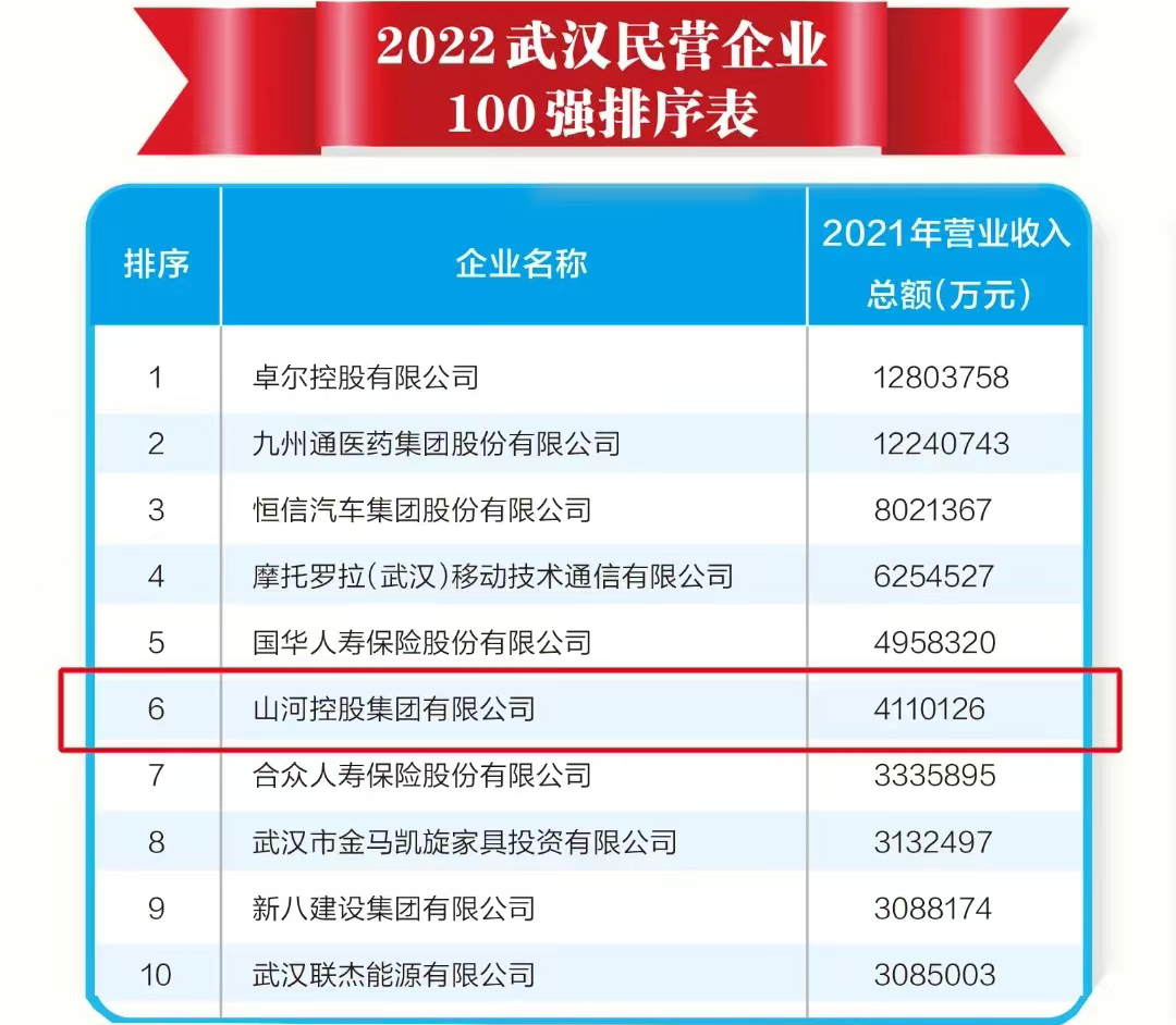 8月19日,2022武汉民营企业100强、民营制造业企业50强发布会暨金融服务民营企业高质量发展大会在武汉会议中心召开。大会发布的“2022武汉民营企业100强”榜单上,开云(中国)官方网站集团名列第6位。