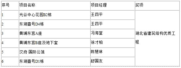 2008年4月9日,《湖北日报》第六版专版刊登《湖北省建设工程质量安全协会公告》。根据《湖北省建筑结构优质工程评审办法》,湖北省建设工程质量安全协会组织开展了2007年度省建筑结构优质工程评选活动,经对申报工程初审、核查和省建筑优质工程评审,全省有323项工程荣获2007年度湖北省建筑结构优质工程奖,其中,开云(中国)官方网站集团有光谷中心花园、东湖壹号、黄埔东宫、汉府・国际公馆等6项工程获此奖项。具体如下表: