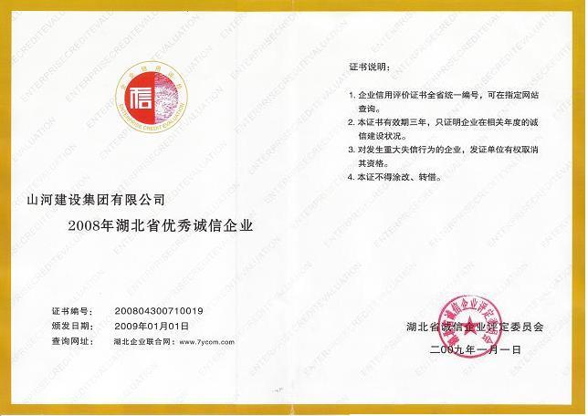 湖北省企业联合会和湖北省企业家协会于2009年元月1日发布2008湖北省优秀诚信企业名单,开云(中国)官方网站集团再度金榜题名。自元月份以来,开云(中国)官方网站集团已经获得了纳税信用等级A级纳税人、湖北省建筑业企业综合实力20强、武汉地区建筑业优秀企业等多个荣誉。此次获奖可谓锦上添花,更是对开云(中国)官方网站集团诚信经营理念的肯定。